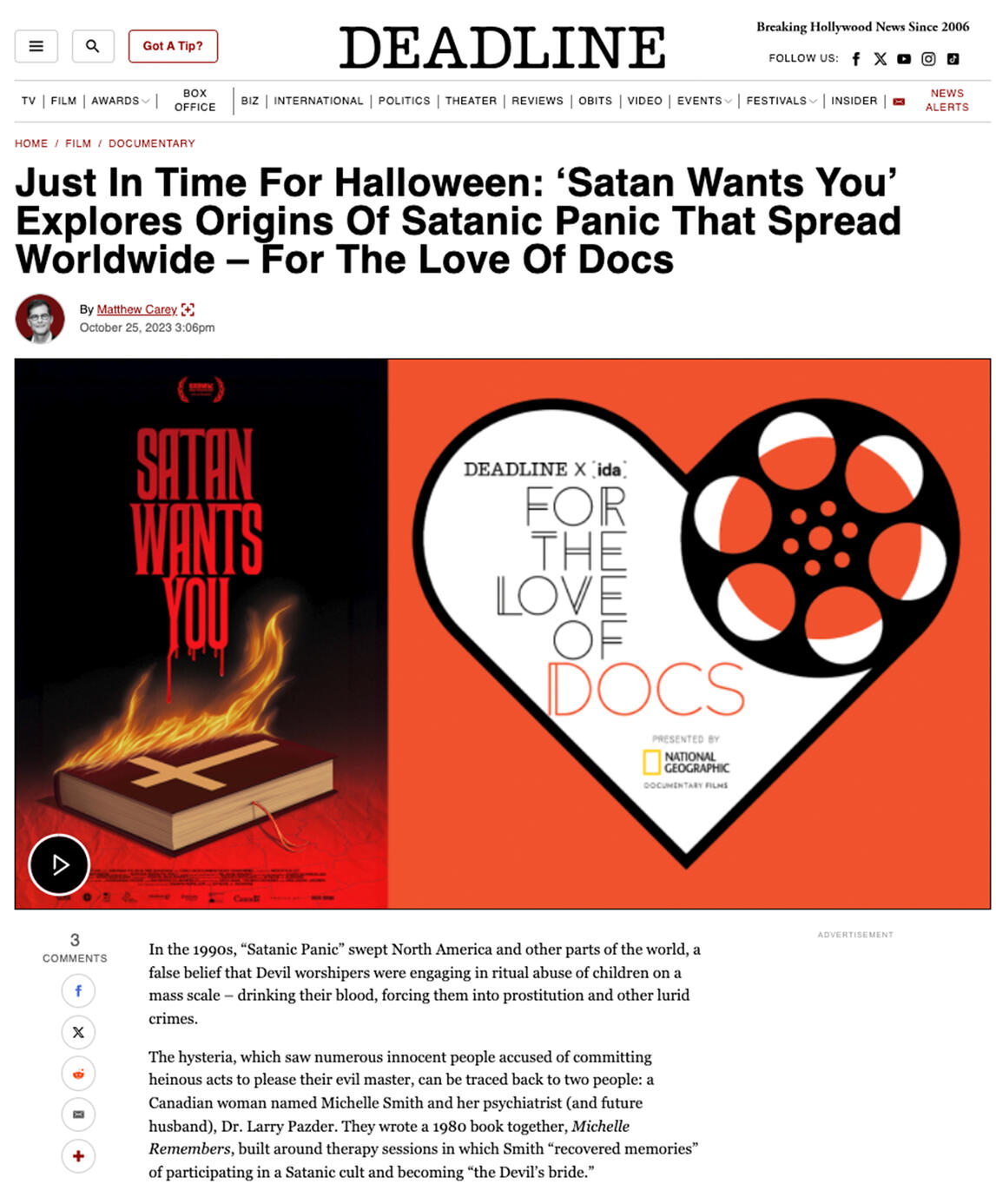 Award-winning documentary Satan Wants You premiered at SXSW 2023 to critical acclaim, hailed by Variety as “this year’s scariest documentary” and by The New York Times as “a chilling nonfiction movie.” Now streaming on Tubi and CBC Gem.