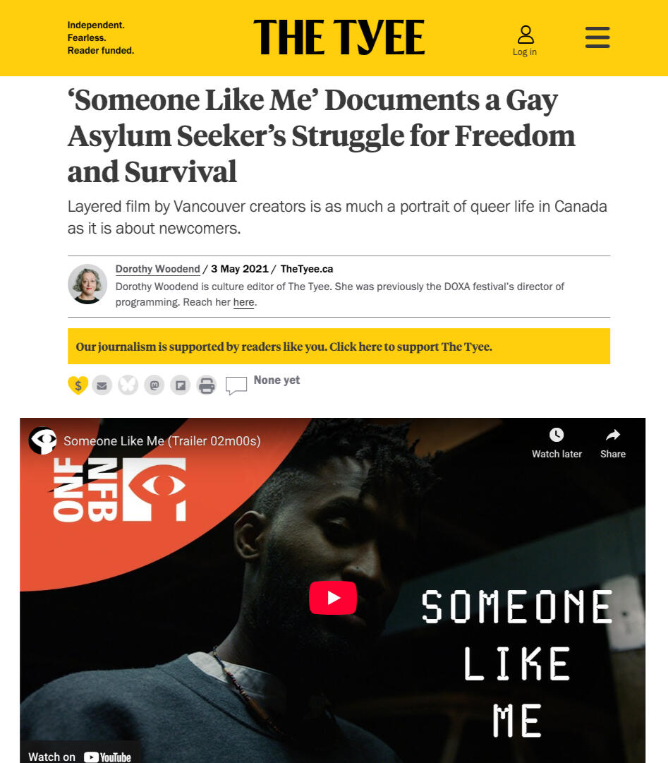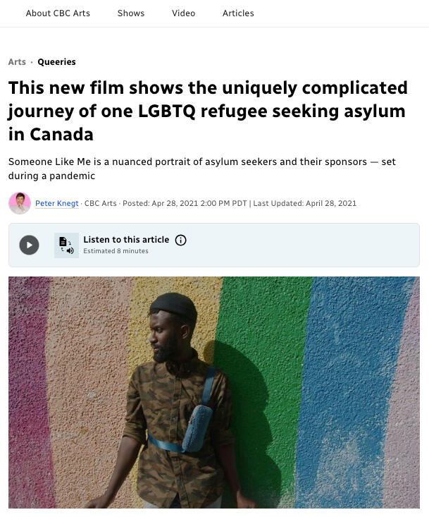 Someone Like Me follows the year-long sponsorship of a queer refugee from Uganda to Vancouver. Directed with Steve J. Adams and produced by the National Film Board of Canada, the film won the Rogers Audience Award at Hot Docs and is now streaming on CBC Gem, Knowledge Network, and NFB.ca.